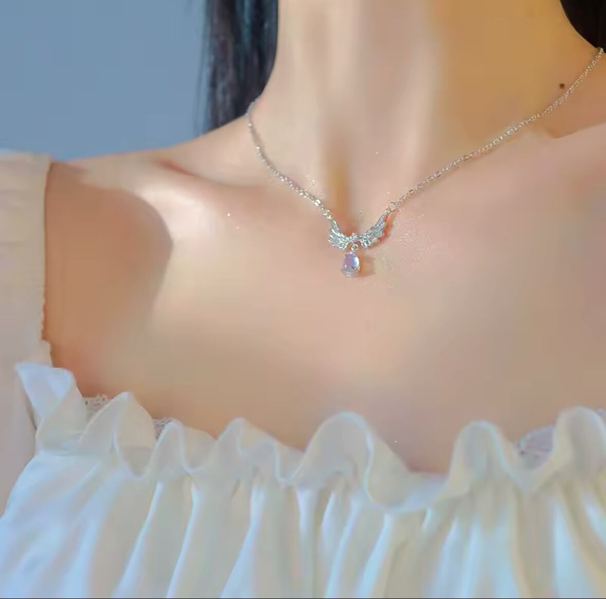 天使の羽の型のペンダントから雫型のストーンがぶら下がり、光が当たるとストーンが輝き、小さいけれど存在感のあるネックレスです。